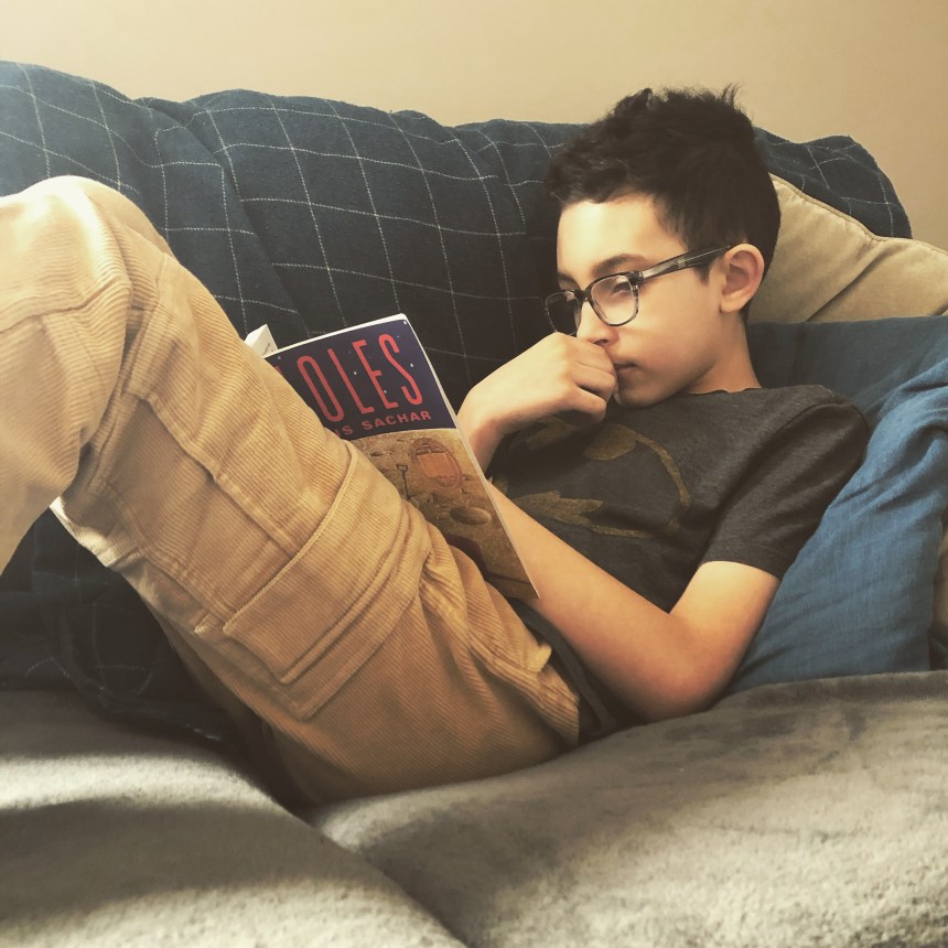 Holes by Louis Sachar: O is nearly finished this one and he’s really enjoying it. It broaches quite a few subjects he doesn’t have experience with so it has sparked some good conversations. (Holes at Chapters/Indigo)